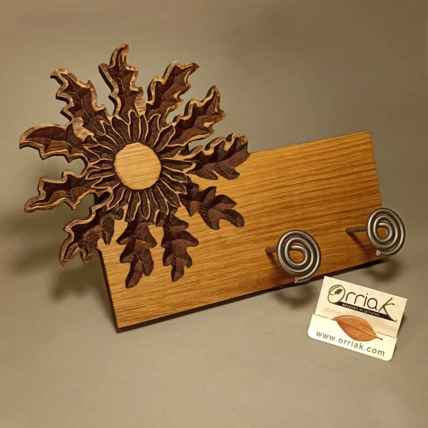 Perchero con Eguzkilore recortado, tallado en madera de Roble con dos pomos de acero.