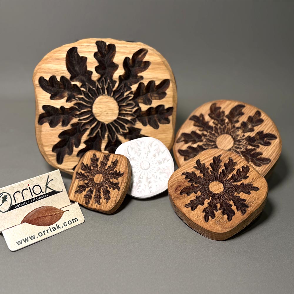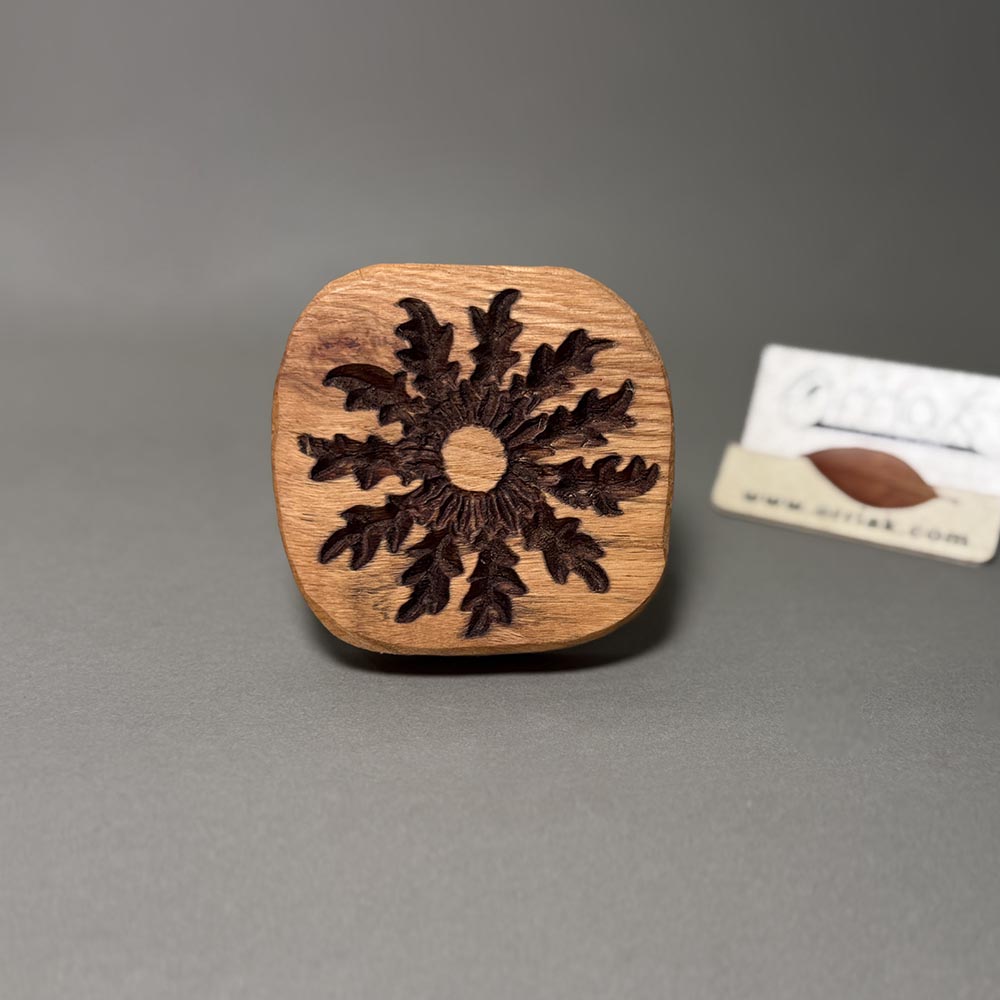 Rodaja con Eguzkilore grabado en madera de Roble.